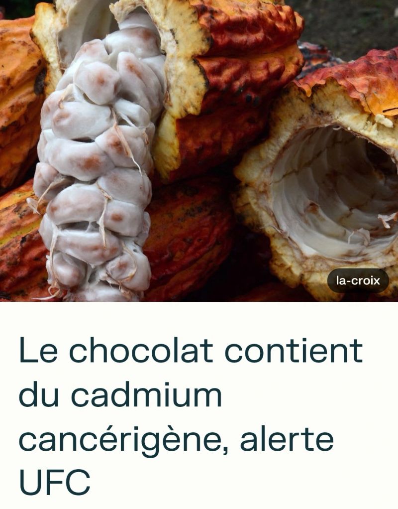L’UFC alerte sur la présence de cadmium dans le chocolat, plus particulièrement le chocolat noir et bio, et l’impact pour les enfants dans cet article : https://tinyurl.com/4df3sd2k.