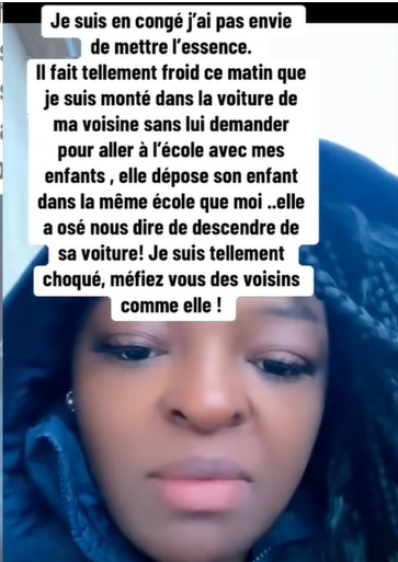 Il fait froid. La personne "calcule" sa voisine, la "guette" à la fenêtre, puis s’invite avec ses enfants dans sa voiture sans demander. Stupéfaction de la propriétaire du véhicule, qui ose refuser ce service imposé. Scandale ! La vidéaste est "choquée".