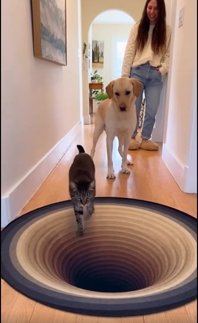 2) Le chien et le chat n'ont pas la même vue du tapis que nous (en tant que spectateur situé à 1,60m au-dessus du tapis). Ils ne se rendent donc pas compte de l'illusion d'optique que nous pouvons avoir.