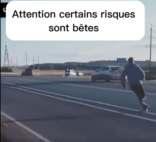 𝗨𝗻𝗲 𝘀𝗰è𝗻𝗲 𝗮𝗯𝘀𝘂𝗿𝗱𝗲 : quelqu’un se couche sur la route, un camion passe au-dessus de lui… et il en ressort en souriant.