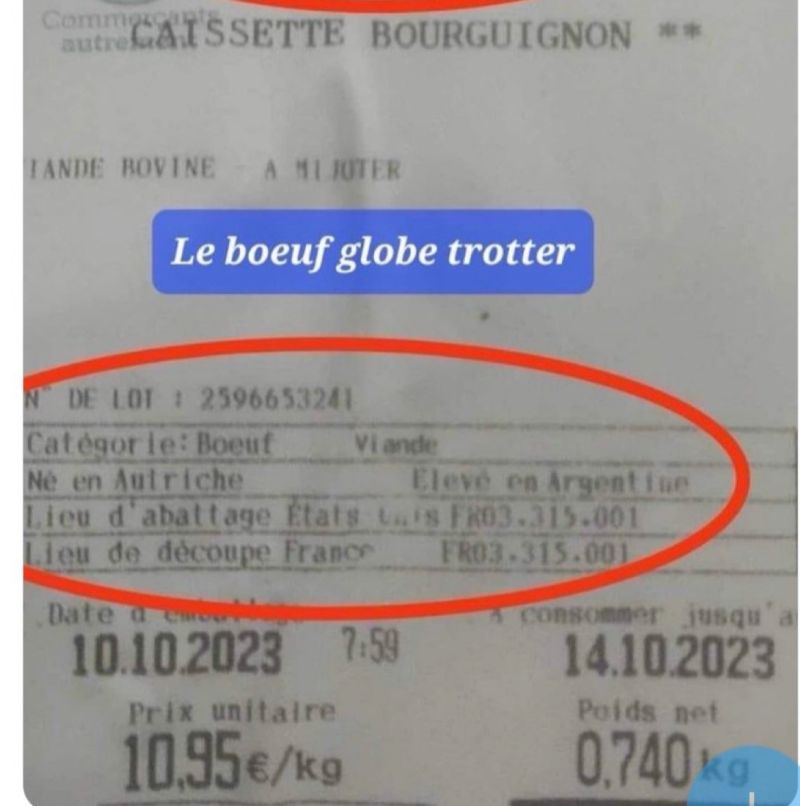 Enfin, France Bleu a pu se procurer la facture de ce bœuf, montrant que l'animal provient de SOCOPA, une entreprise située à Coutances en France. La facture précise que le bœuf est né, a été élevé et abattu en France. https://cvc.li/Lyvht