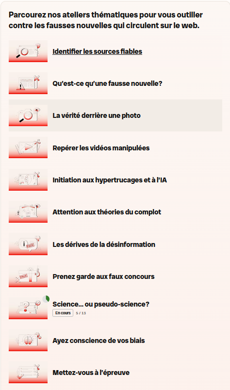 L’équipe de fact-checking de Radio-Canada, les Décrypteurs, vous plonge directement dans le bain avec un quiz de photos et de vidéos, agrémenté d’un petit cours de présentation des techniques permettant de repérer les fausses images, telles que TinEye ou Forensically .