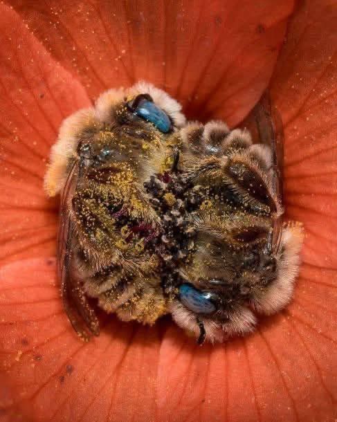 Le photographe Joe Neely a capturé par hasard une scène qui a ému le monde entier : deux abeilles, couvertes de pollen, endormies à l’intérieur d’une fleur orange.