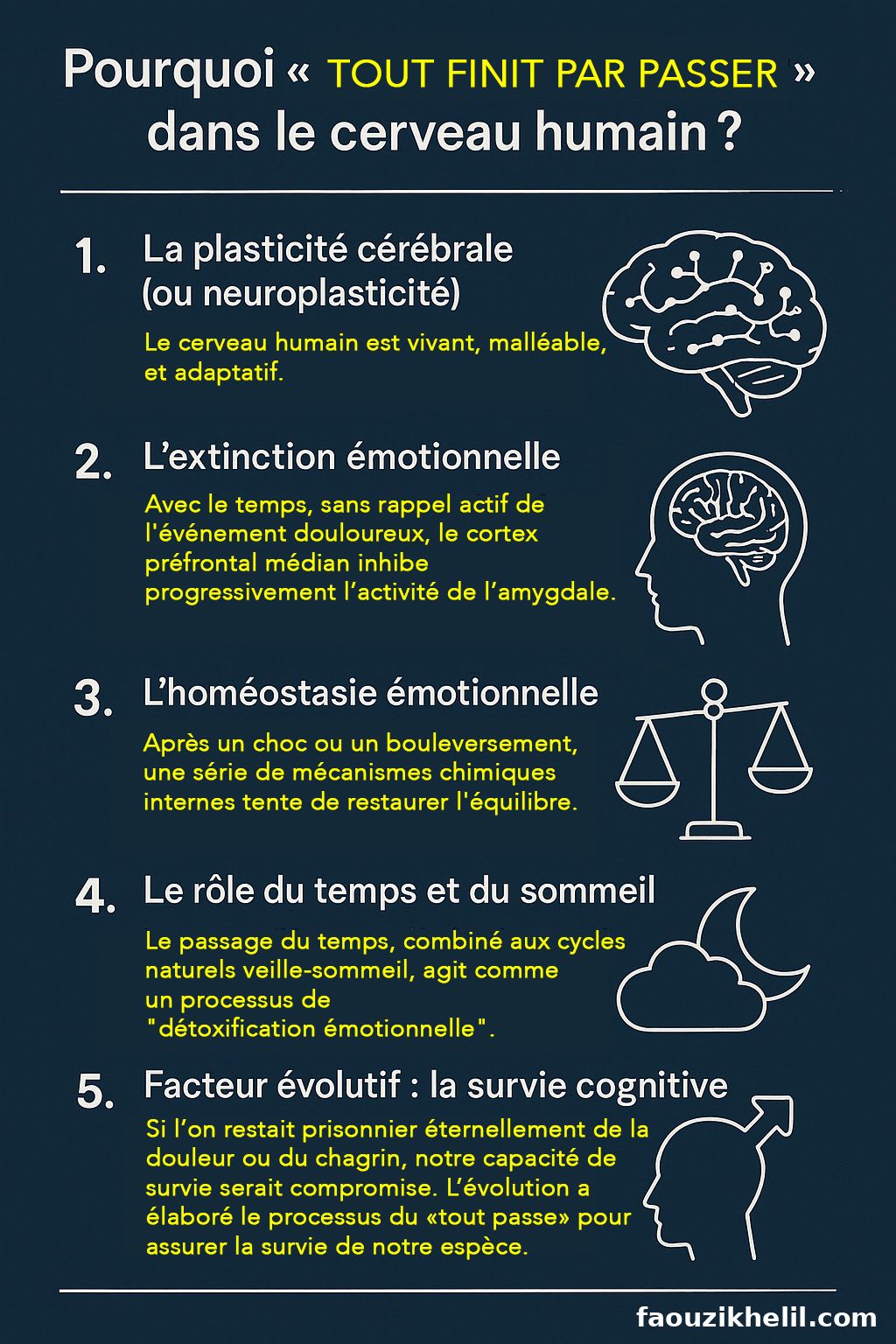 Cette idée repose en grande partie sur un ensemble de mécanismes neuronaux et neurochimiques qui orchestrent la plasticité cérébrale, l'extinction émotionnelle, et la régulation homéostatique des émotions. Explications :